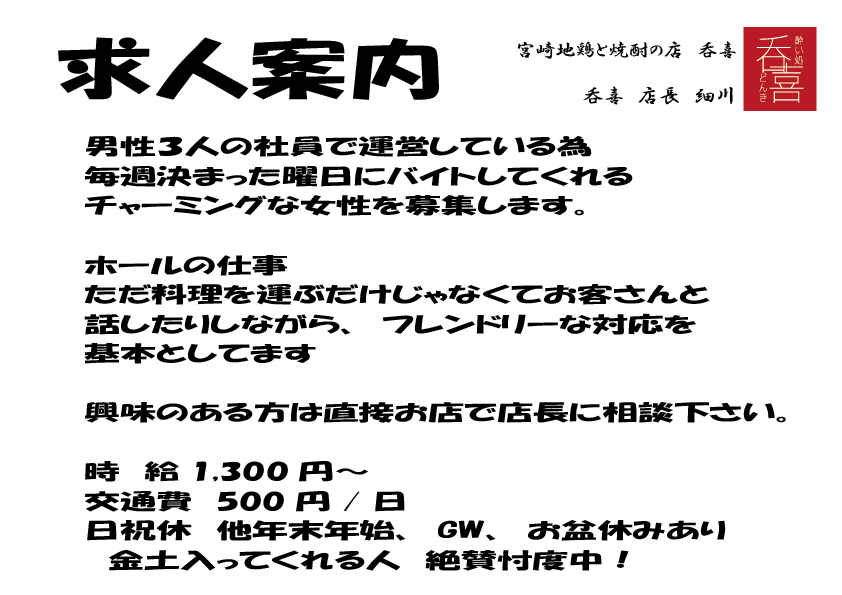 カシオっていう電子機器メーカー技術者から脱サラして、はや17年。酒好きが高じて始めた呑兵衛が喜ぶ居酒屋。 その名も「呑喜」。試行錯誤の繰り返しで、なんだかあっという間のこのお店。今や、常連さんやら、外人さんやら。本当にもう、ありがたいことです。
